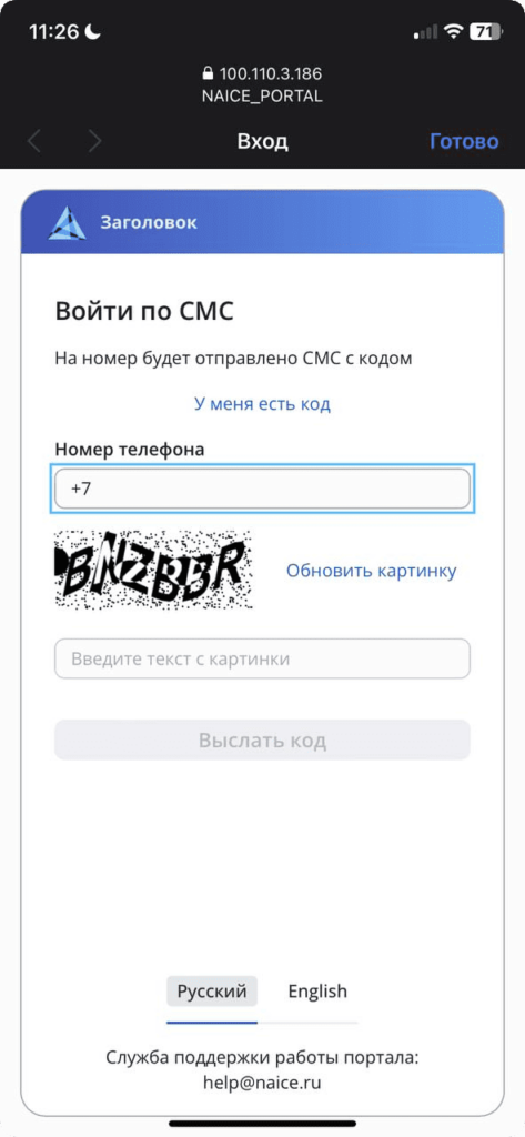 Пользователь подключается к гостевой Wi-Fi сети, а NAICE перенаправляет на страницу авторизации. Вводится номер телефона, и пользователь получает SMS с кодом и входит в сеть. Легитимный гостевой доступ, изолированный от основной корпоративной сети, – для пользователей, полный контроль и отчётность – для администраторов.