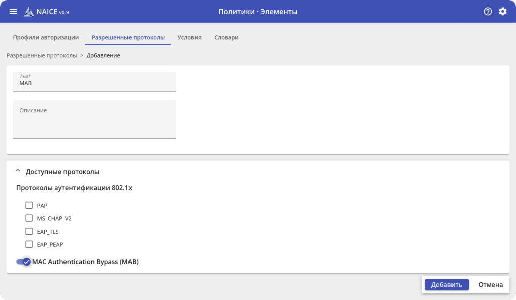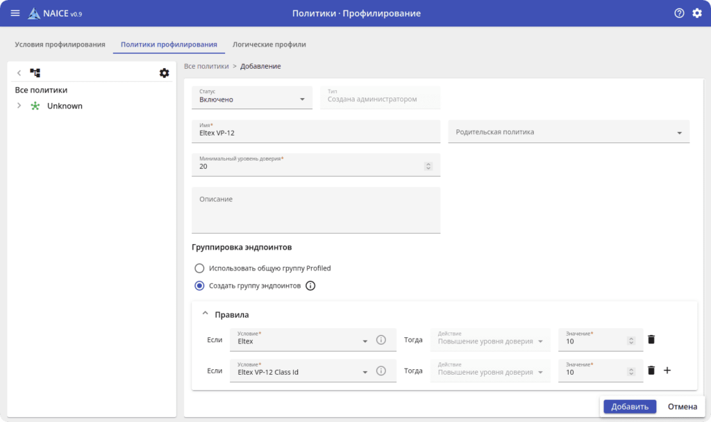 Политики задают «правила игры», определяющие поведение системы при запросе на доступ для каждого устройства и пользователя. NAICE включает политики RADIUS, TACACS+ и профилирования. Администратор единожды настраивает их, а NAICE самостоятельно распознаёт новые устройства и применяет к ним указанные политики: выделяет необходимые VLAN, устанавливает правила фильтрации (ACL) и предоставляет доступ согласно заданным условиям.