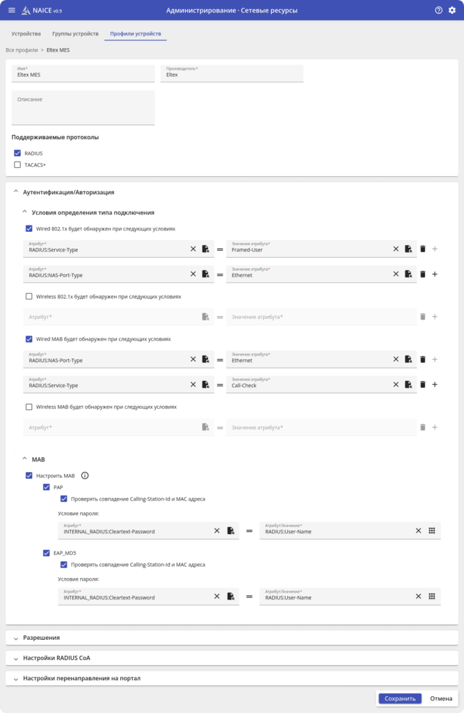 На основе профилирования NAICE определяет тип устройства по множеству критериев, в том числе по MAC-OUI или DHCP-пробам, автоматически применяет к нему соответствующую политику доступа и группу. Это позволяет системе понимать, что именно подключилось к сети – рабочая станция, телефон, маршрутизатор и т. д.