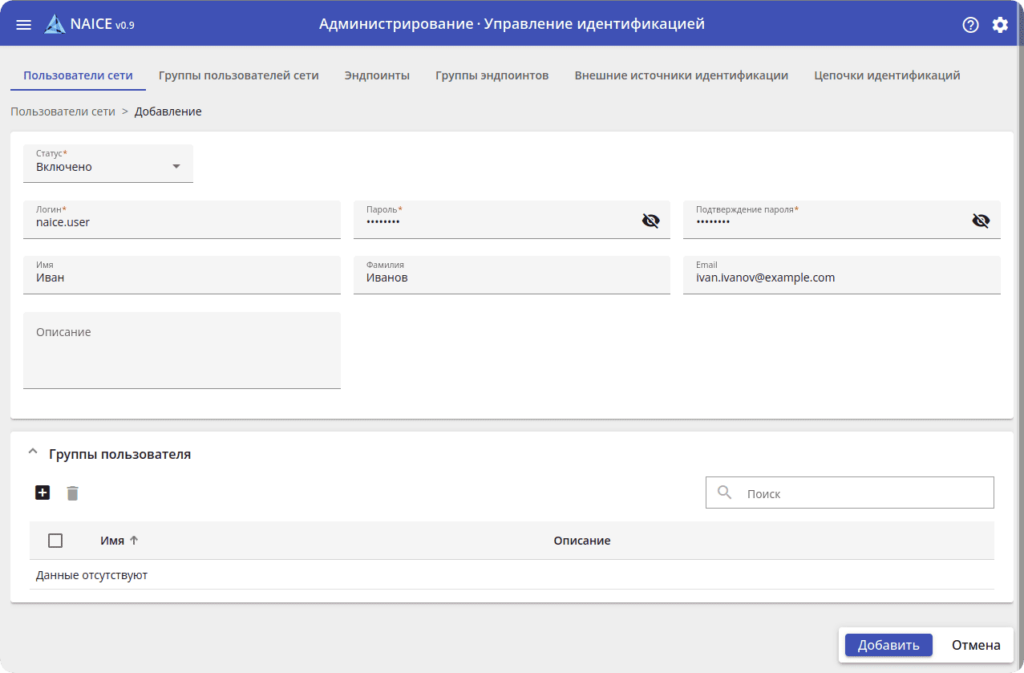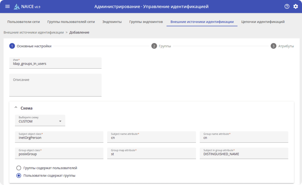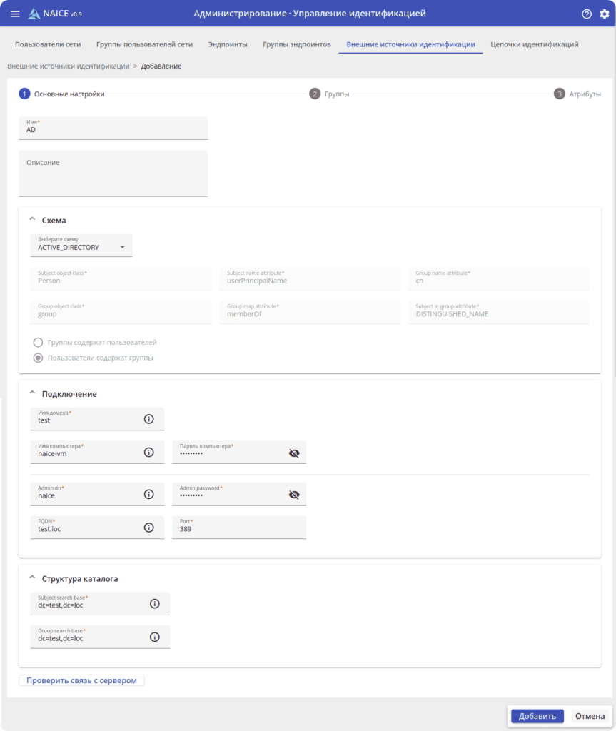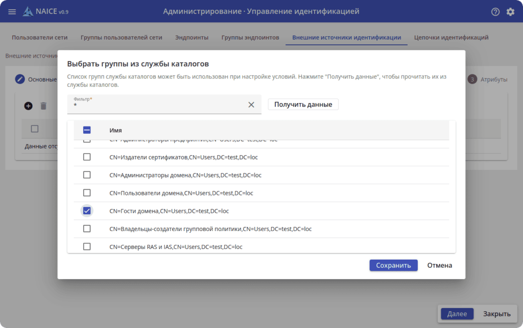 Помимо локальной базы пользователей, NAICE взаимодействует с внешними источниками идентификации MS Active Directory и OpenLDAP. Это позволяет использовать существующие корпоративные базы для управления доступами без необходимости дублировать учётные записи: система работает с корпоративными каталогами напрямую.